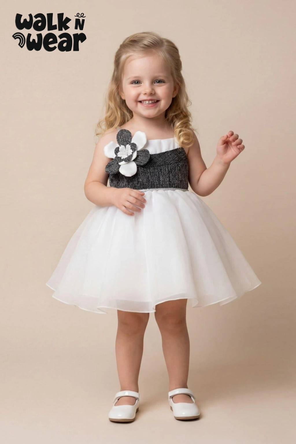 Make your little princess shine with this elegant white party wear dress designed for special occasions. Featuring a stylish dual-tone bodice with a beautiful floral applique and a soft flared tulle skirt, this dress creates a graceful and charming look. The premium fabric ensures comfort while maintaining a luxurious appearance, making it perfect for birthdays, weddings, and festive celebrations.